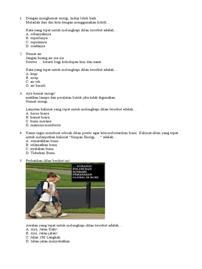 Contoh Soal Melengkapi Iklan Tentang Hemat Energi Guru Indonesia from 2.bp.blogspot.com Melengkapi kalimat bahasa indonesia tema 1 subtema 3 pembelajaran 6. Kalimat yang tepat untuk melengkapi paragraf tersebut adalah. Learn vocabulary, terms and more with flashcards, games and other study tools. Untuk kelas 5 mi/sd tema 3 semester 1. Sebelum lanjut ke latihan soal, bacalah petunjuk cara mengerjakan latihan soal ini. Objek bisa berbentuk sebuah kata benda atau frasa kata benda. Melengkapi kalimat iklan harus menggunakan bahasa yang menarik. Level pengetahuan dan pemahaman ski 19.
